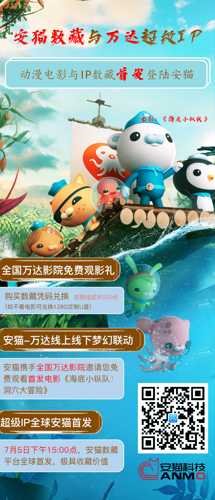 值此万达集团电影《海底小纵队:洞穴大冒险》即将全国上映之际,安猫数藏平台与万达集团旗下IP《海底小纵队》达成全方位合作,将为广大安猫数藏爱好者奉上一抹夏日清凉:《海底小纵队》超级IP将于7月5日下午3点全球首发登陆安猫数藏平台,并携手全国万达影院邀请您一起来免费观看全球知名动画IP《海底小纵队》系列大电影的第二部:《海底小纵队:洞穴大冒险》(7月9日全国同步上映),开启属于你我的夏日探险。首发电影,万达影院联动,超级 IP 安猫首发,全球限量。《海底小纵队》超级IP值得拥有与收藏。详情如下: